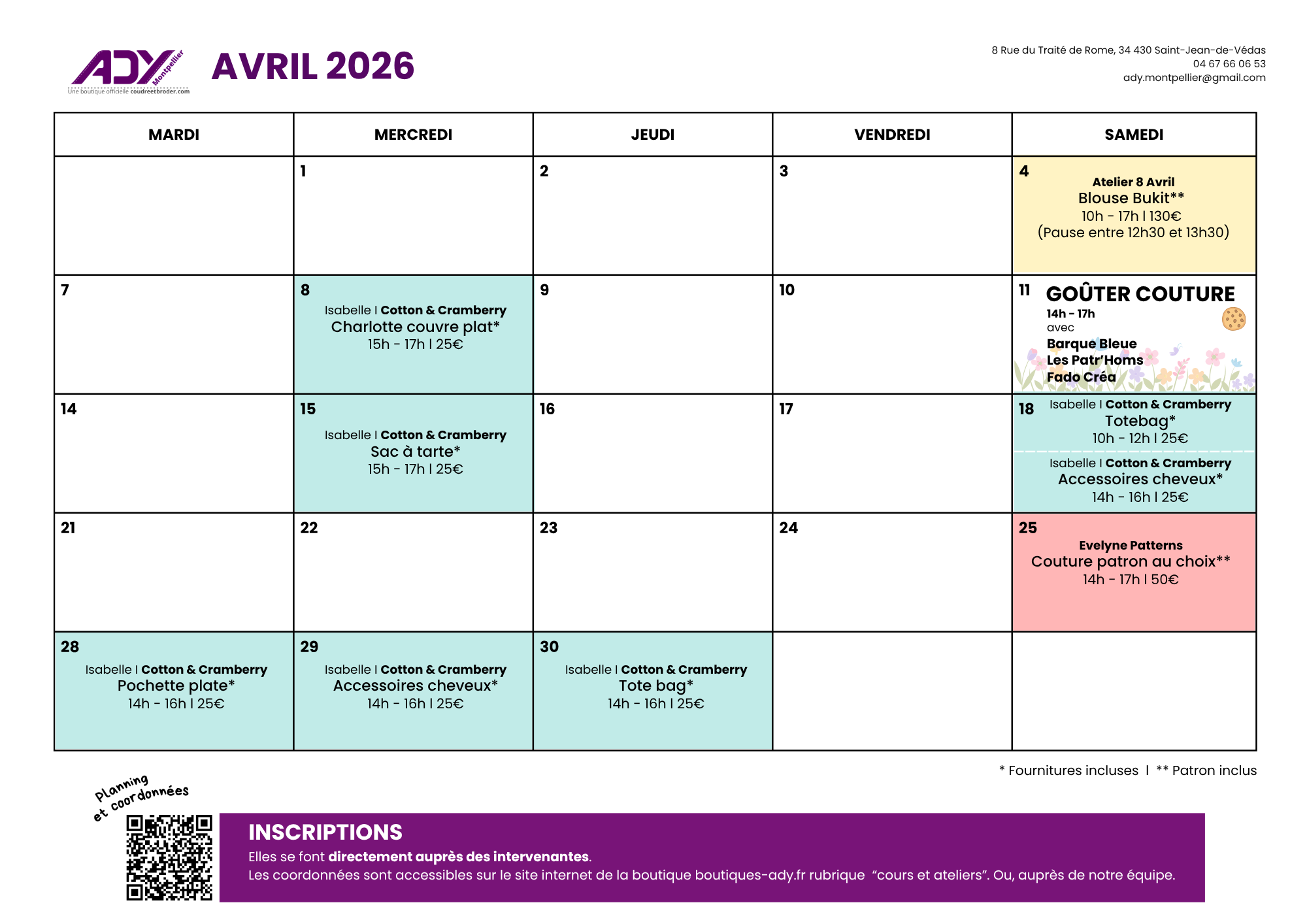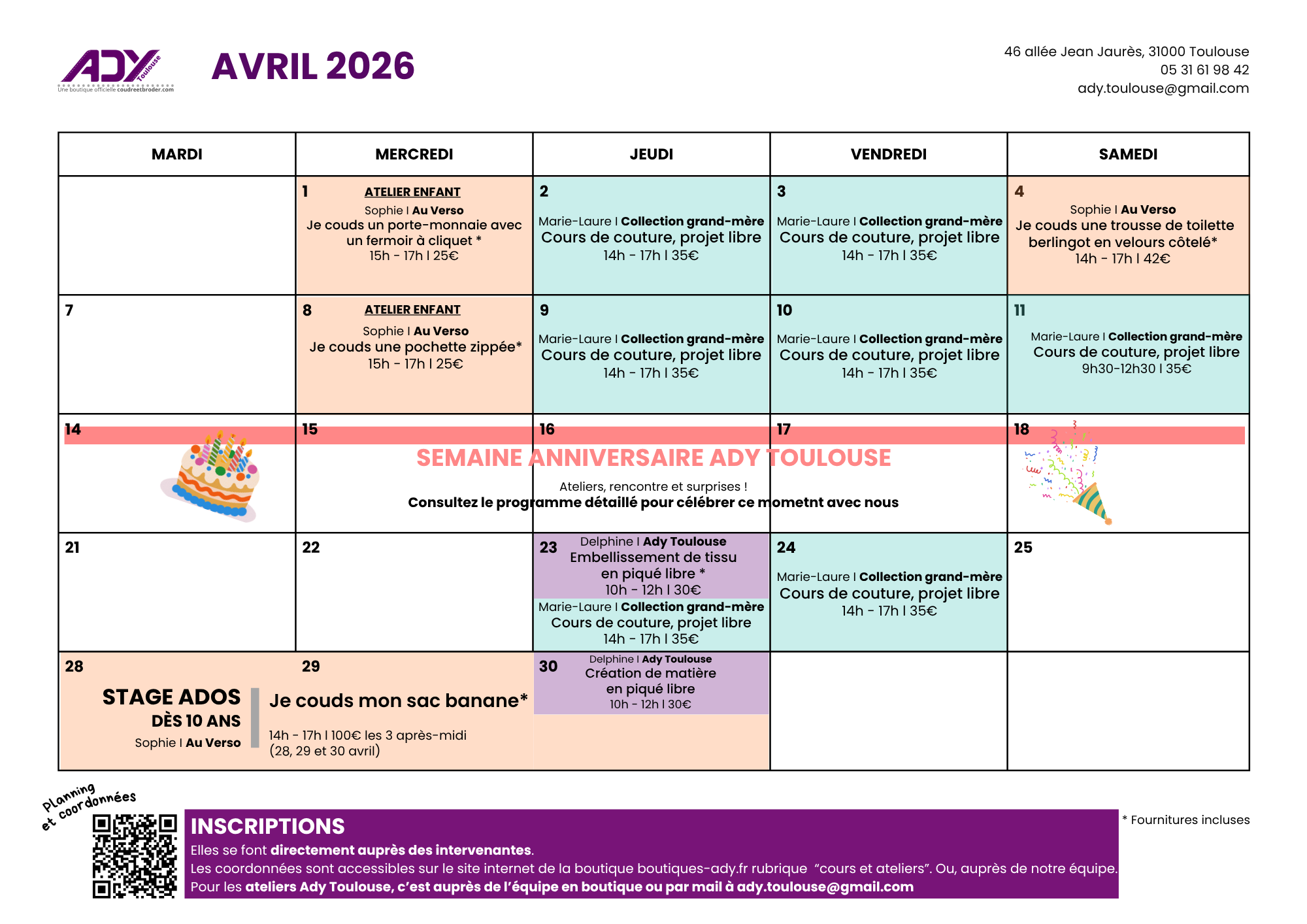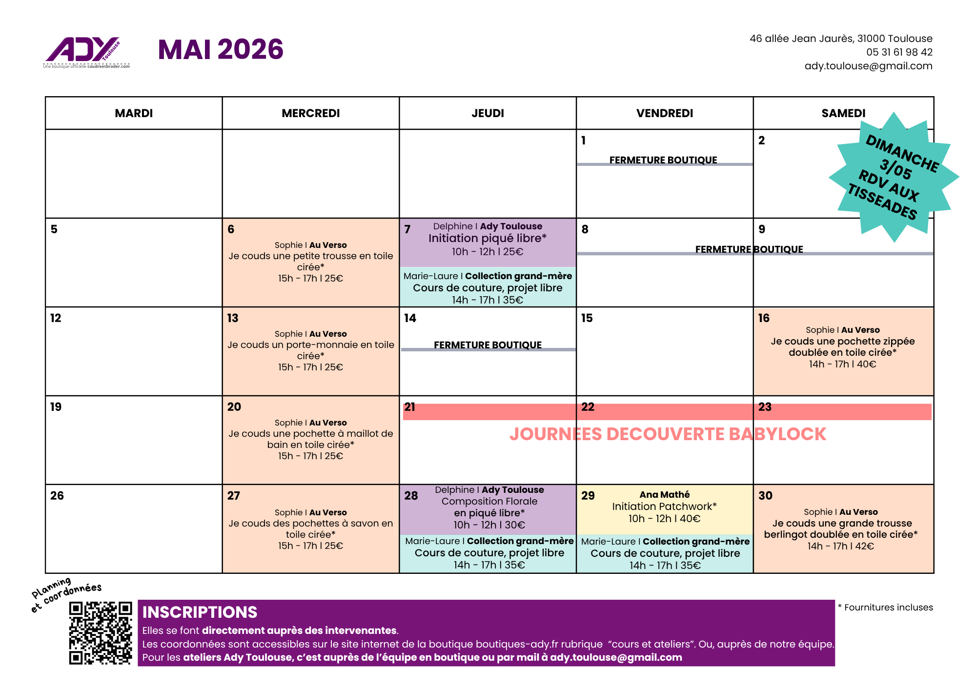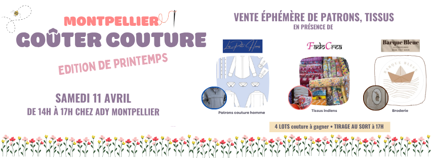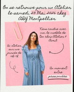 - Atelier piqué libre : auprès de la boutique Ady Toulouse par téléphone ou mail Attention : limité à 5 pers/ateliers