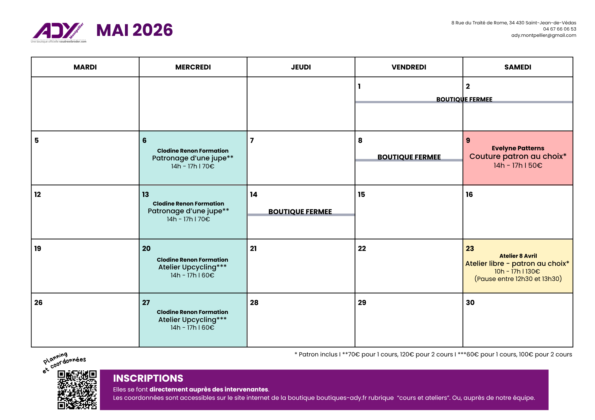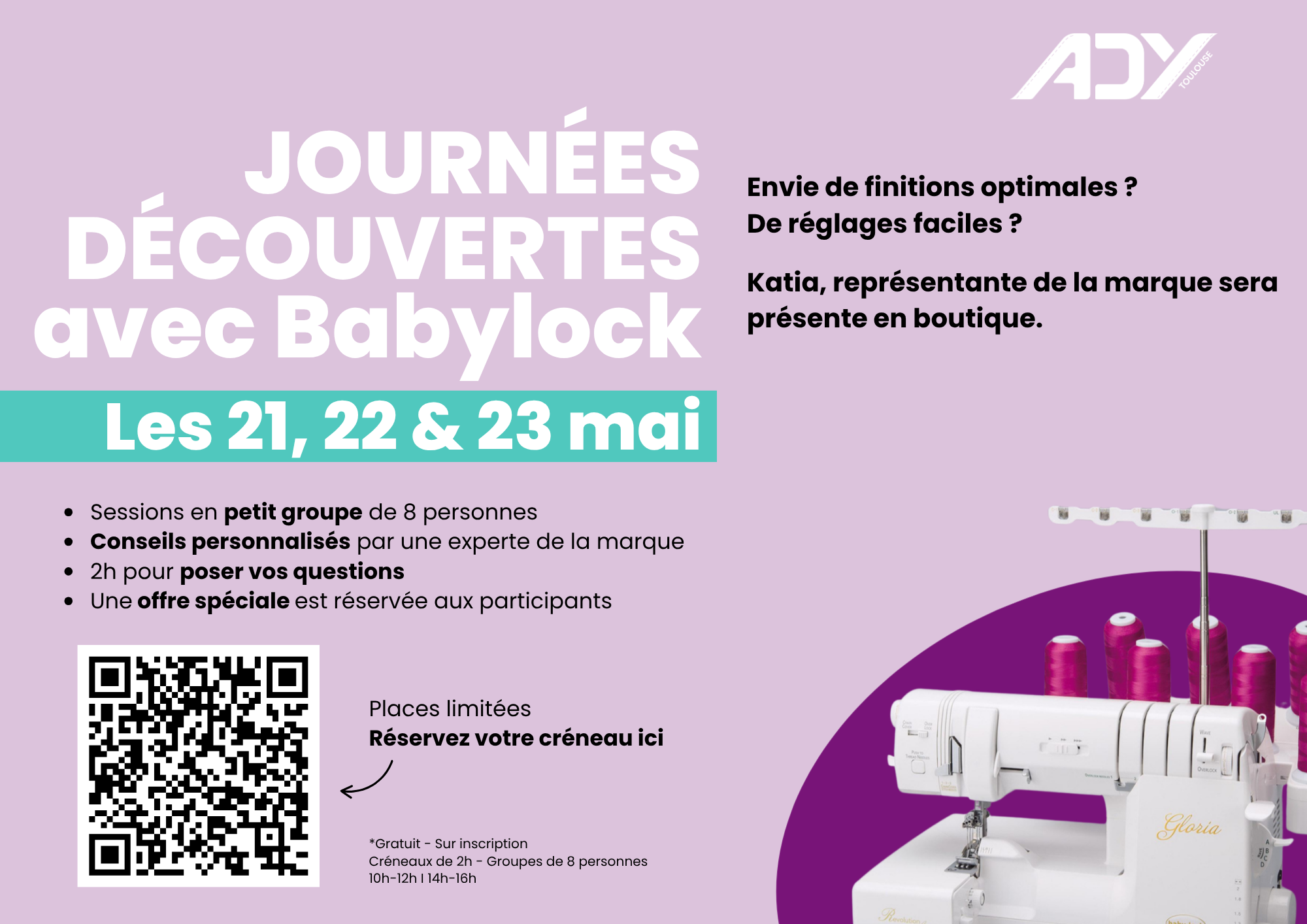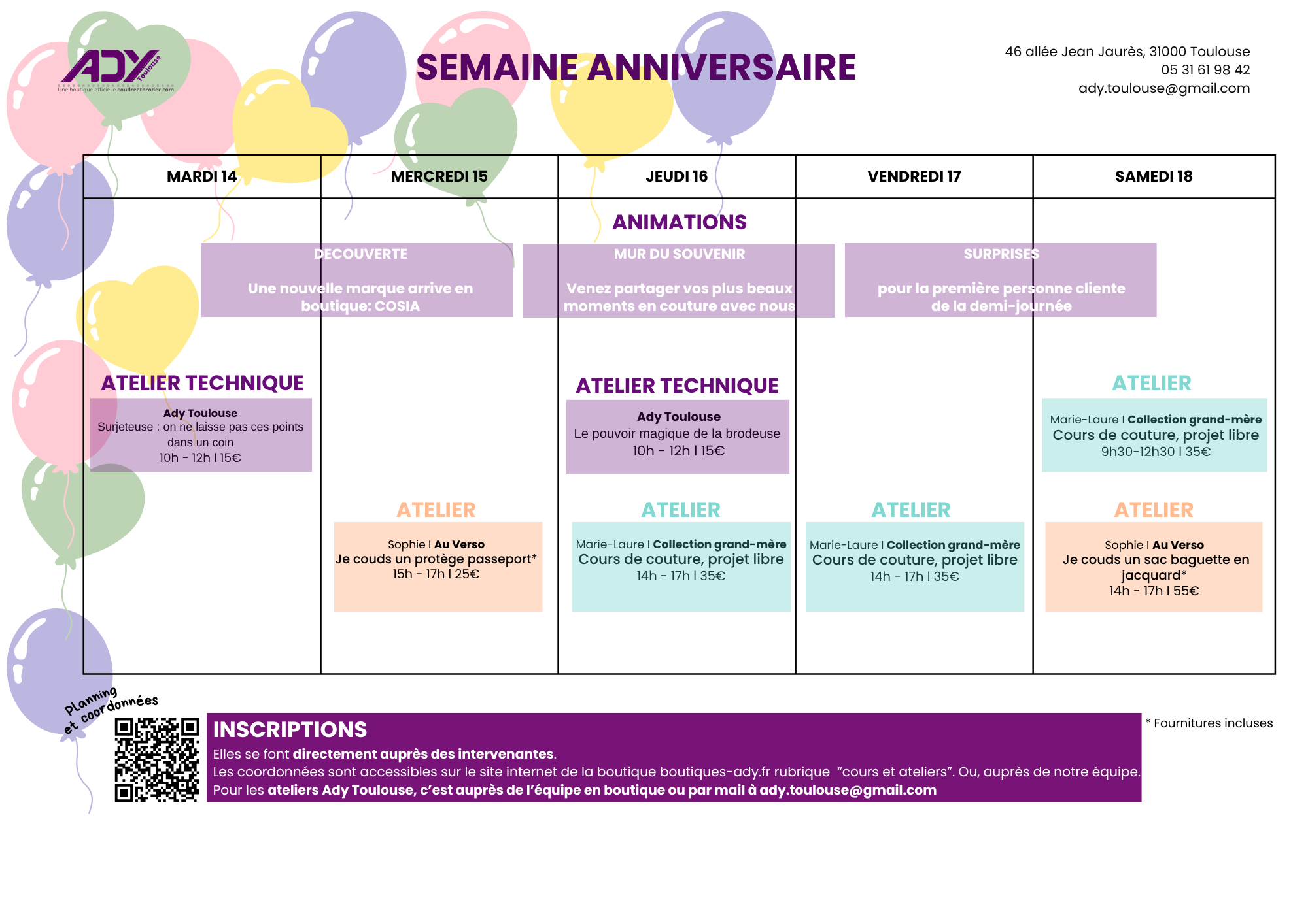 - Atelier piqué libre : auprès de la boutique Ady Toulouse par téléphone ou mail Attention : limité à 5 pers/ateliers